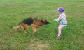 Další část byla pro nás nejzajimavější. Za doprovodu psovodu nám byly předvedeny ukázky ochrany pozemku spojené i s útoký jednotlivých psů na figuranta.
